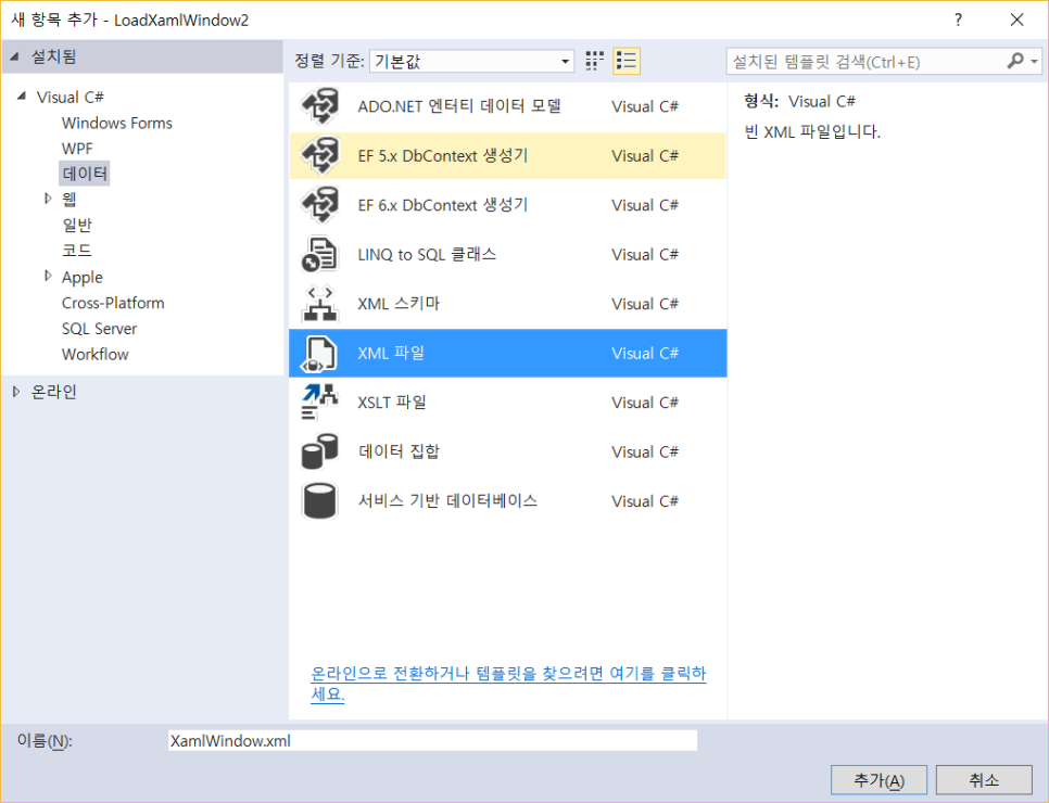1. 비주얼 스튜디오 -> WPF 응용프로그램 , 프로젝트명 : LoadXamlWindow