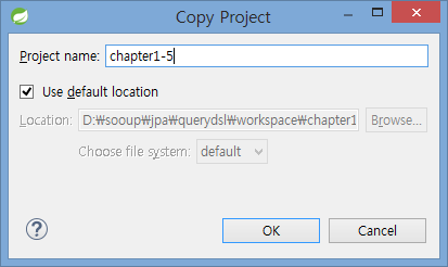 앞서 작업한 프로젝트 chapter1-4를 선택한 상태에서 ctrl+c, ctrl+v 키를 연속으로 눌러서 소스 전체를 복사해 chapter1-5라고 명명하면서 프로젝트를 추가합니다.